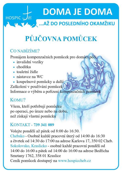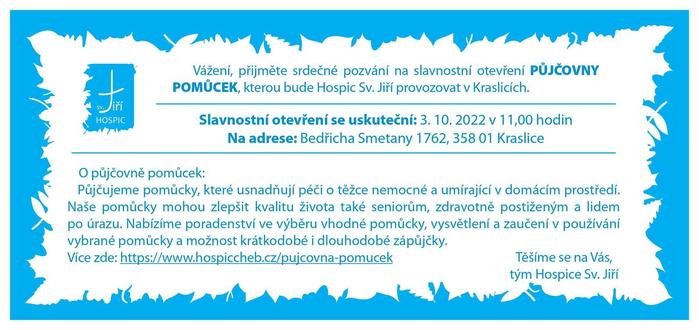 přijměte srdečné pozvání na slavnostní otevření PŮJČOVNY POMŮCEK, kterou bude Hospic Sv. Jiří provozovat v Kraslicích.